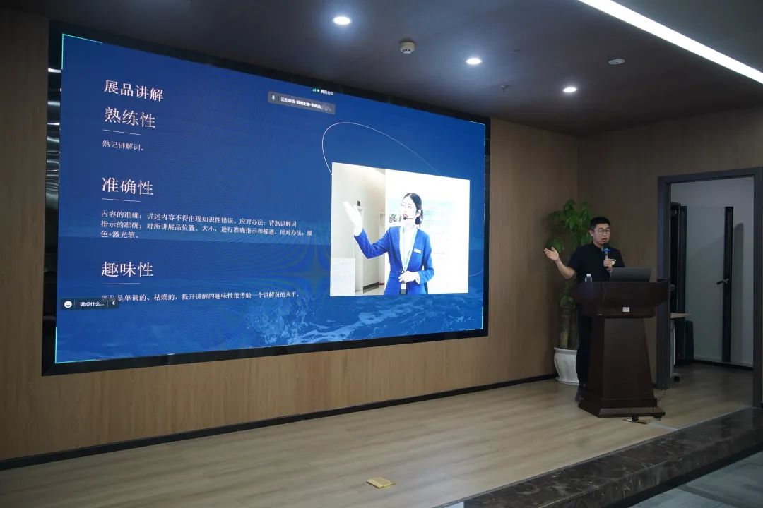 講座培訓(xùn)結(jié)束后,參訓(xùn)人員到一樓展廳進行了現(xiàn)場講解示范。在覃宵曉、胡安琪的示范講解后,大家對講解手勢、講解語速、講解語境、講解重點等方面的技巧逐項進行現(xiàn)場交流。
