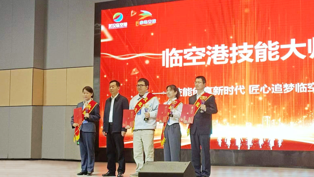 在表彰環節,來自我司研發分析室的鄭春紅(上圖左一)榮獲“臨空港技能大師”稱號并登臺領獎。